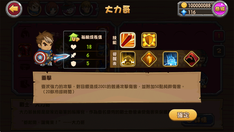大力哥曾经是皇家近卫军的指挥官,作为壹名优秀的战士他会承受伤害来保护队友。