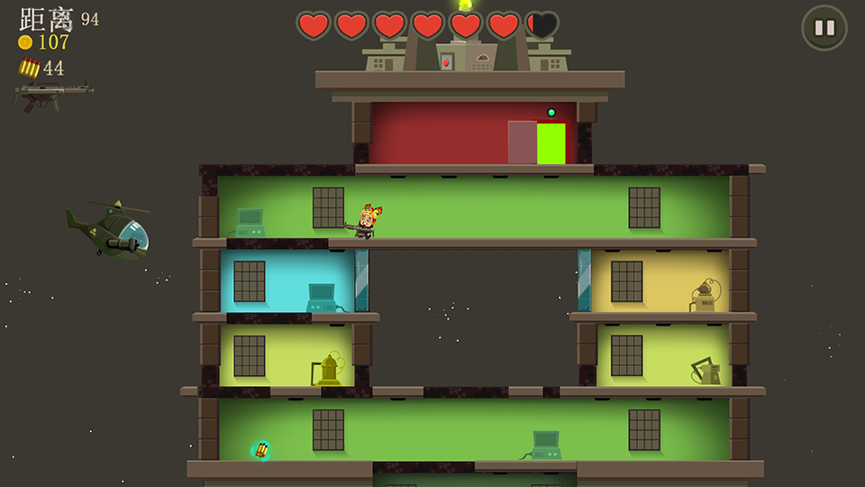 游戏让大家体验到了只需一手操控也能感受猛烈撞击的快感,刚开始贴心的新手教程也足矣让玩家一目了然,只需上下滑动屏幕,便可操控这位大胡子上下跳跃来回穿梭撞击在各个楼层之间,并在躲避敌人的攻击同时攻击敌方解救人类。