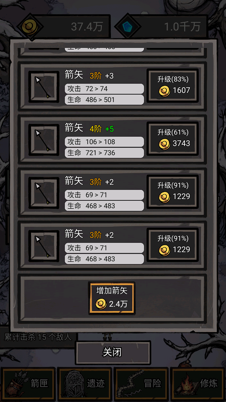 2、刚进入游戏需要打造自己的第一把箭矢才能射击敌人,当然金币足够可以为你的箭矢升级,这样射箭会造成更多的伤害;