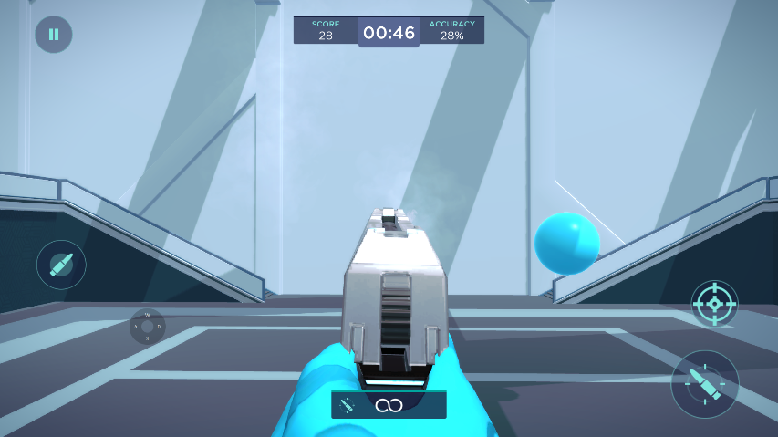 REACTIVETRACK项目中达到了70000-80000这个区间的话,可以尝试它的进阶练习,球体追枪。目标没有了血条,要求在一分钟之内一分钟跟枪到底,并且目标随机移动的幅度非常大。玩起来的感觉就像0能量的毛妹在滋一个满状态开了黄圈活蹦乱跳的卢西奥一样。建议在练习此项目之前给自己的鼠标和右手腾出一个比较大的空间,并且准备一个大一点的鼠标垫。