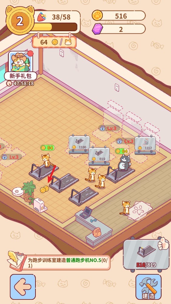 1、进入游戏后,首先点击右下角的“建造”按钮,这里你可以开始建设健身房的各个房间。