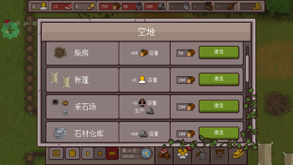 2、进入游戏后你需要在营地空地内建造各种设施,如帐篷、采石场、仓库、农田等
