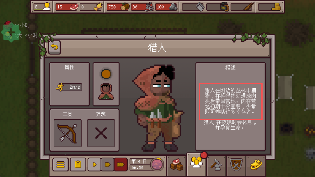 4、每个幸存者拥有的能力不同,例如猎人白天能带肉回来,探险家会带回铁件、守卫可以消灭丧尸