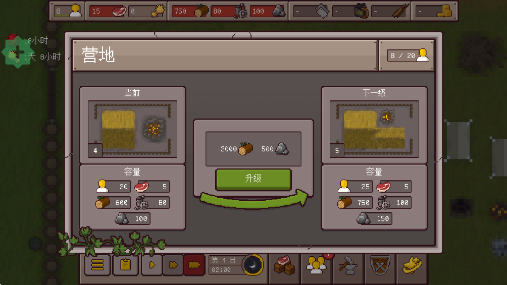 5、拥有足够的资源时,你需要升级营地来提升人员、食物的容量,并不断扩大你的营地