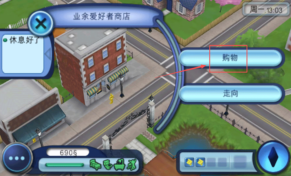 4、到达城镇后找到业余爱好商店,并点击购物