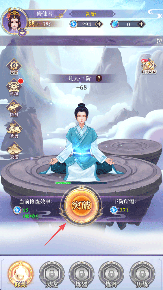 3、游戏中的角色会自动修炼,可以突破时点击突破即可完成进阶