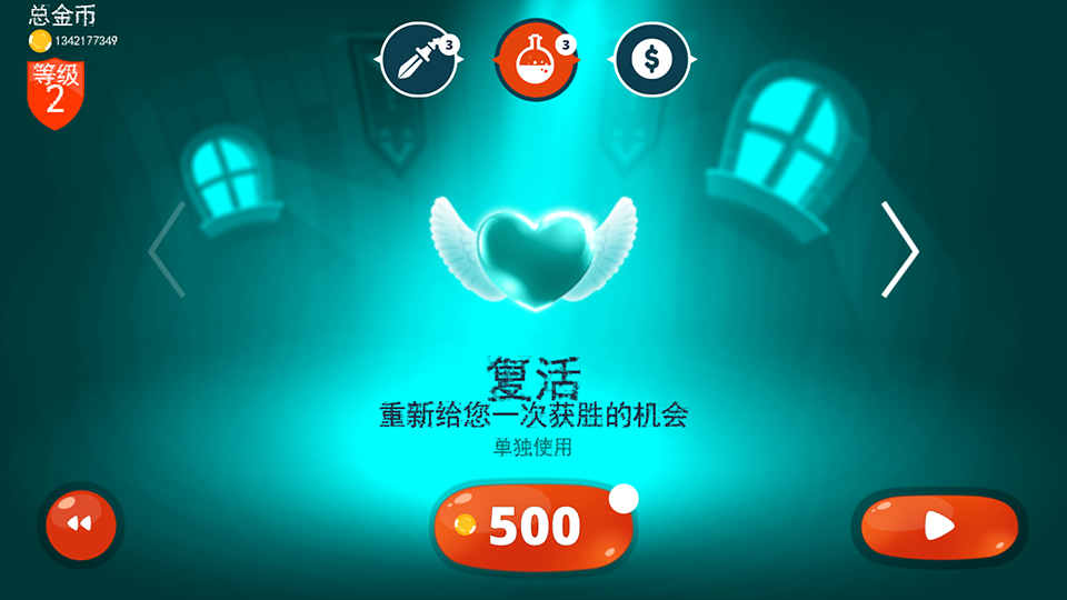 金币除了可以买道具、怪物之外,还可以购买一些一次性的道具,比如第二颗爱心,可以让我们有续命的机会,不过这个是一次性的,不是一直可以有的。