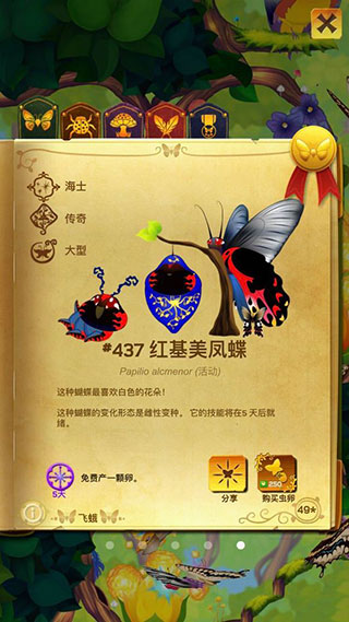 后期达到上限后继续扩展森林,只能通过天价蜜露购买了。增加蜜露收益的蝴蝶有很多,比如加速蝴蝶冷却时间的,翻倍蜜露的,但普遍稀有级别低,范围效果小,它不但对增加收益效果有限,还往往挤占空间,所以并不推荐。这里仅推荐一种,技能为全森林蝴蝶五倍收益。冷却时间五天,森林蝴蝶越多,珍贵的越多,它的效果越强。因此是越后期越好用。不过其实森林上限一百零几只的空间差不多够用了,不常用的蝴蝶放仓库就行了。所以它的含金量不如前面两类。